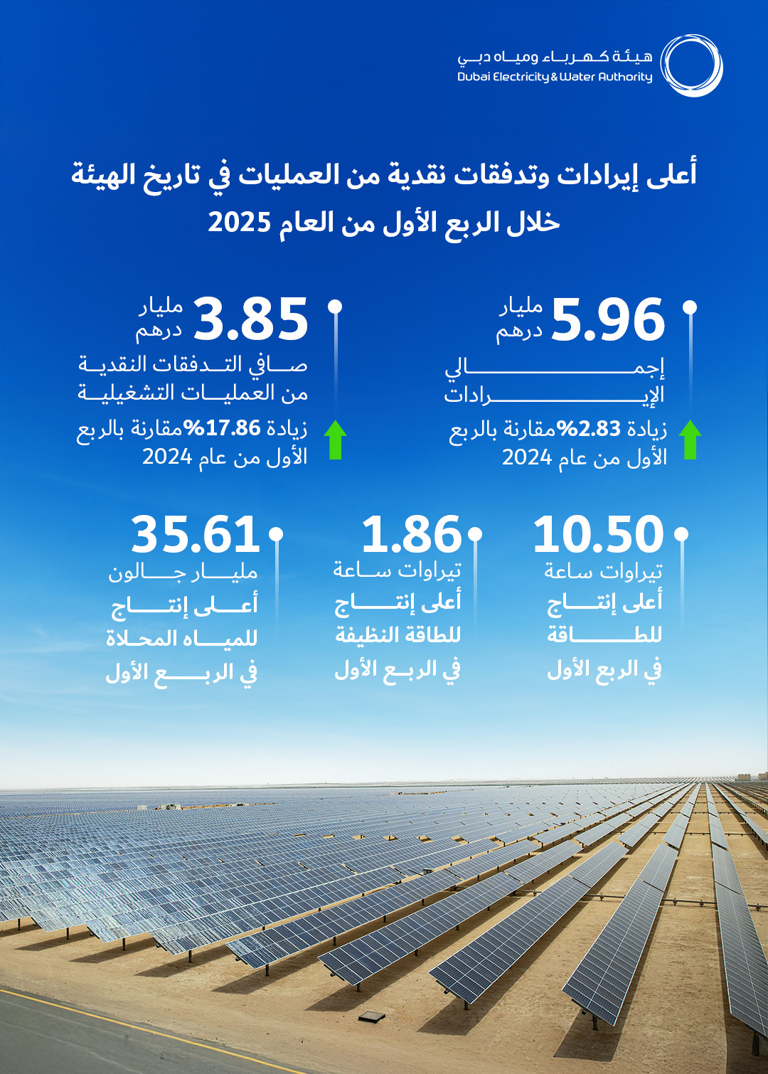 أعلنت هيئة كهرباء ومياه دبي ش.م.ع، المزود الحصري لخدمات الكهرباء والمياه في دبي، والمدرجة في سوق دبي المالي تحت الرمز (DEWA) والرقم الدولي الموحد للأوراق المالية (ISIN: AED001801011)، نتائجها المالية الموحدة للربع الأول من عام 2025، حيث سجلت إيرادات ربع سنوية بقيمة 5.96 مليار درهم، وبلغ إجمالي الأرباح قبل احتساب الفائدة والضرائب والإهلاك واستهلاك الدين (قبل الاستقطاعات) 2.43 مليار درهم، والأرباح التشغيلية 838 مليون درهم، وصافي الأرباح 496 مليون درهم. كما حققت الشركة تدفقات نقدية تشغيلية قياسية بلغت 3.85 مليار درهم، ما أدى إلى ارتفاع الرصيد الإجمالي للنقد وما يعادله إلى 8.17 مليار درهم، بزيادة قدرها 2.07 مليار درهم مقارنةً بالرصيد المسجل في نهاية عام 2024.