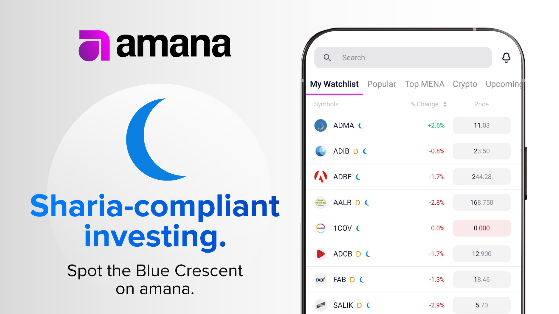The new system introduces a blue crescent moon icon on the amana platform that instantly marks assets that meet Sharia standards. The feature is powered by Zoya, whose compliance technology helps ensure real-time, reliable screening for Sharia-compliant assets directly within the amana trading app.