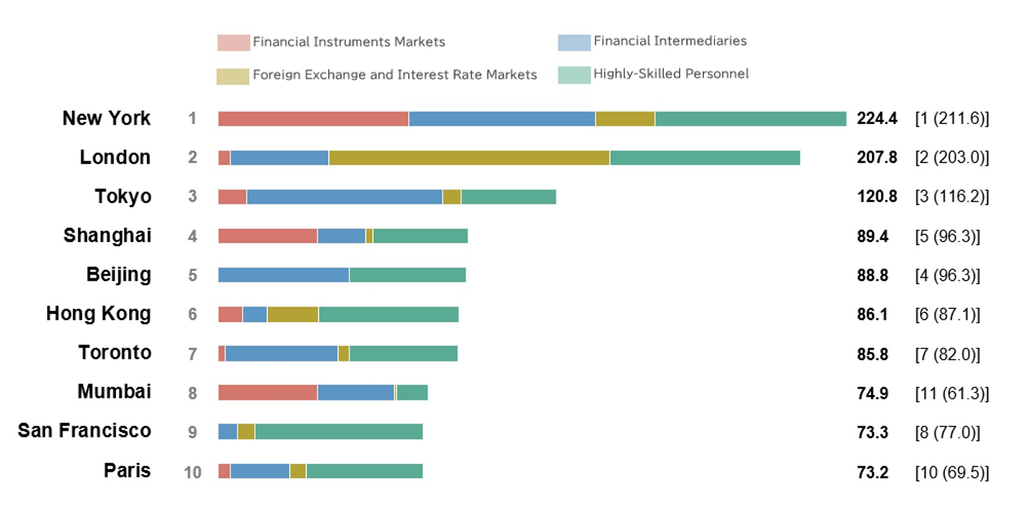 بكين (المركز الخامس): حافظت العاصمة الصينية على مكانتها في المركز الثالث في أسواق الأدوات المالية وحصلت على المركز الأول في فئة "أفضل مقرات رئيسية للبنوك في العالم". ومع ذلك، انخفضت تصنيفاتها في مجال قوتها الآخر، وهو "الموظفون ذوو المهارات العالية"، حيث هبطت المدينة من المركز الخامس إلى المركز السابع في هذه الفئة.