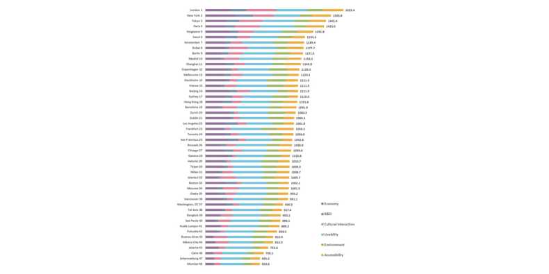 مع أن التقدم الناتج من تعافي لندن من الوباء قد تراجع مقارنة بالعام الماضي، فإن النتيجة الإجمالية للمدينة ارتفعت قليلاً، مما ضمن لها الحفاظ على مكانتها في المركز الأول. وبالإضافة إلى ريادتها الشاملة في مجال "التفاعل الثقافي"، حصلت لندن مؤخراً على المركز الأول في مجال "سهولة الوصول". وتحسنت نتائج المدينة في مجال "قابلية العيش" في مؤشرات مثل "بيئة العمل"، حيث ارتفعت إلى المركز السادس في هذه الفئة. والتحسن المستمر في المؤشرات البيئية في لندن من الممكن أن يؤدي إلى زيادة أخرى في النتيجة الإجمالية للمدينة.