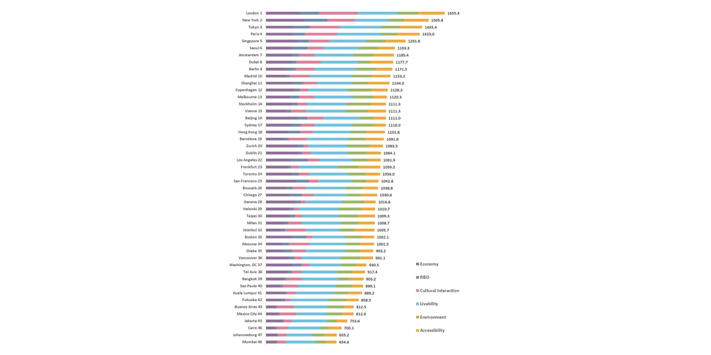 ولم يطرأ أي تغيير على المراكز الخمسة الأولى (حيث جاءت لندن في المركز الأول، ونيويورك في المركز الثاني، وطوكيو في المركز الثالث، وباريس في المركز الرابع، وسنغافورة في المركز الخامس). ولكن طوكيو وباريس وسنغافورة حققت خطوات كبيرة، واقتربت من موقع نيويورك؛ وشهدت كل من هذه المدن الثلاث تحسنات في المؤشرات المتعلقة بـ"التفاعل الثقافي"، مثل عدد السائحين الأجانب ووسائل الراحة المتوفرة للزوار، بما في ذلك عدد غرف الفنادق. وانعكس على النتائج أيضًا قرار استضافة دورة الألعاب الأولمبية الصيفية 2024 في باريس، ونمو السياحة الدولية في طوكيو وسنغافورة، والتي تأخرت بسبب إجراءات مراقبة الحدود الحذرة