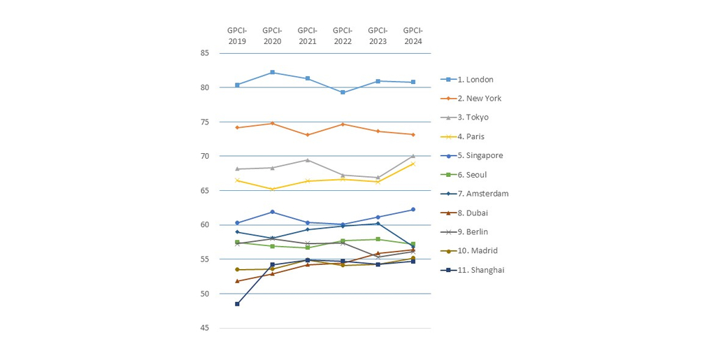 في حين تواصل لندن الحفاظ على مكانتها المهيمنة، فقد حققت باريس وطوكيو خطوات ملحوظة نحو الأمام. وشهدت باريس، التي ارتفعت من المركز الثالث إلى المركز الثاني، وطوكيو، التي ارتفعت من المركز الخامس إلى الثالث، زيادة كبيرة في النتائج بما في ذلك في مجال "عدد الزوار الأجانب".