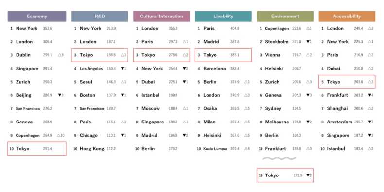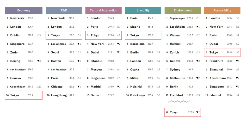 حققت طوكيو مكاسب كبيرة في تصنيفها الإجمالي هذا العام، حيث اقتربت من نيويورك، وتوافرت لديها عوامل مساهمة في تقدمها، بما في ذلك ارتفاع عدد الزوار الأجانب الذين استفادوا من انخفاض سعر الين. ومع ذلك، فإن باريس تلاحقها عن كثب، حيث تحتل المركز الرابع، ما يشير إلى حدة المنافسة بين المدينتين العريقتين. ولقد شهدت طوكيو تحسينات في أربع مجالات، وهي: "البحث والتطوير"، و"التفاعل الثقافي"، و"قابلية العيش"، و"سهولة الوصول"، حيث حققت أكبر زيادة في الدرجات بين جميع المدن الـ48 هذا العام. وبرغم هذه التطورات، فإن مجال "الاقتصاد" في المدينة، الذي كانت شهد انحدارًأ نسبيًا، يعد مجالاً يحتاج إلى التحسين.