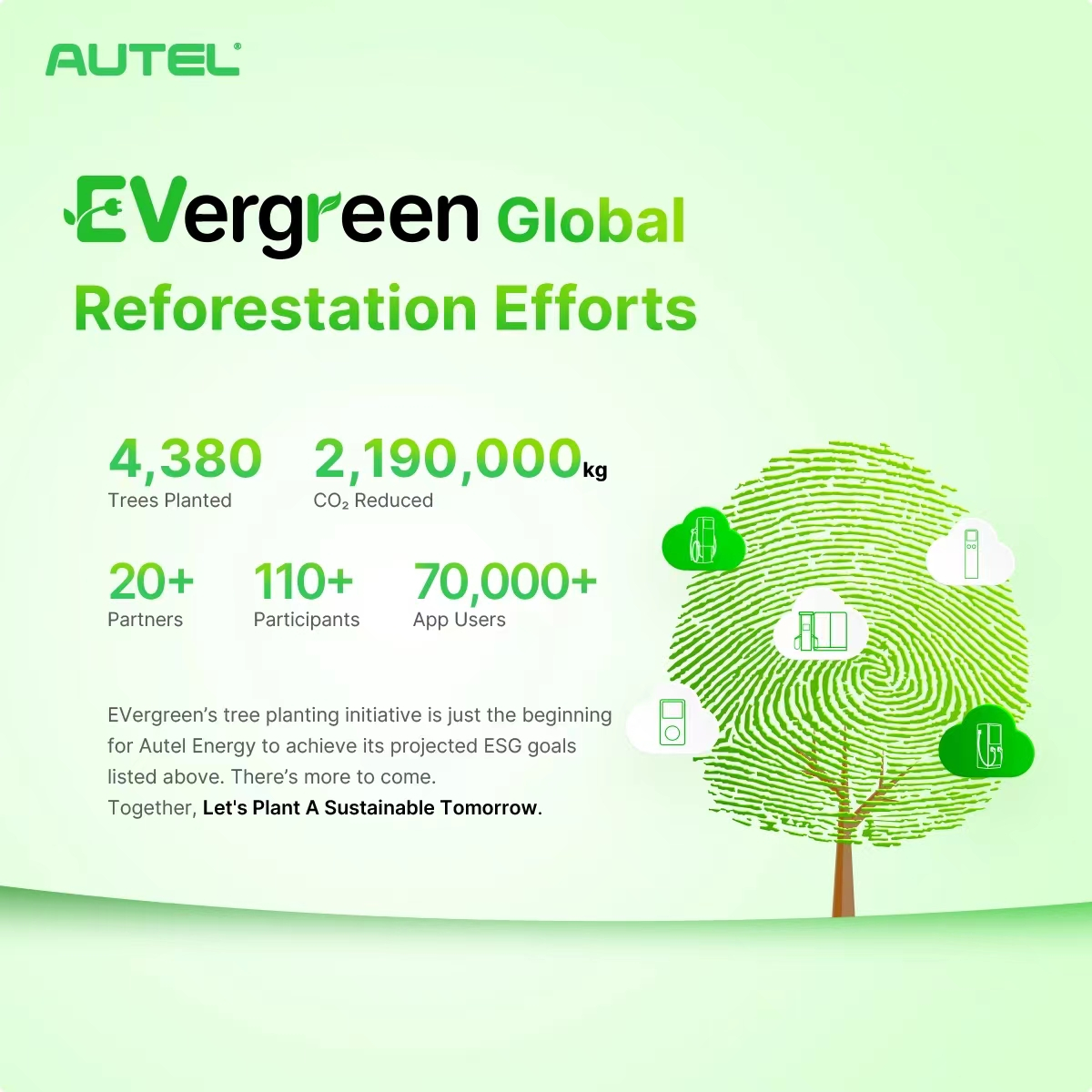 في ضوء هذا الزخم، تكشف Autel Energy النقاب عن ميزة EVergreen Challenge في Autel Charge App، مما يمكّن العملاء من المساهمة في الحفاظ على البيئة ببساطة عن طريق شحن سياراتهم الكهربائية، وعند تحقيق أهداف خفض ثاني أكسيد الكربون، ستعمد Autel إلى زراعة شجرة نيابةً عنهم بغية إحداث تأثير ملموس.