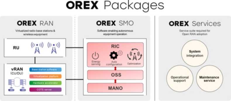 ومن خلال OREX SMO، توفر OREX برمجيات طورتها شركة NTT لتسهيل التصميم والتكوين والمراقبة الفعالة لشبكات الوصول اللاسلكية، مما يتيح تشغيل الجهاز بشكل مستقل ومحسّن. يسمح اعتماد OREX SMO بالتحسين التلقائي لتصميم الشبكة، مما يقلل من عبء عمل التصميم بنسبة تصل إلى 50%، خاصةً في الحالات المعقدة التي قد تستغرق عادةً عدة أسابيع. كما أنه يقلل من عبء العمل التشغيلي عن طريق أتمتة المهام مثل تعديل زاوية هوائي المحطات الأساسية، وهو أمر بالغ الأهمية لتأمين منطقة التغطية. يتوافق OREX SMO مع المواصفات القياسية التي حددها تحالف O-RAN.