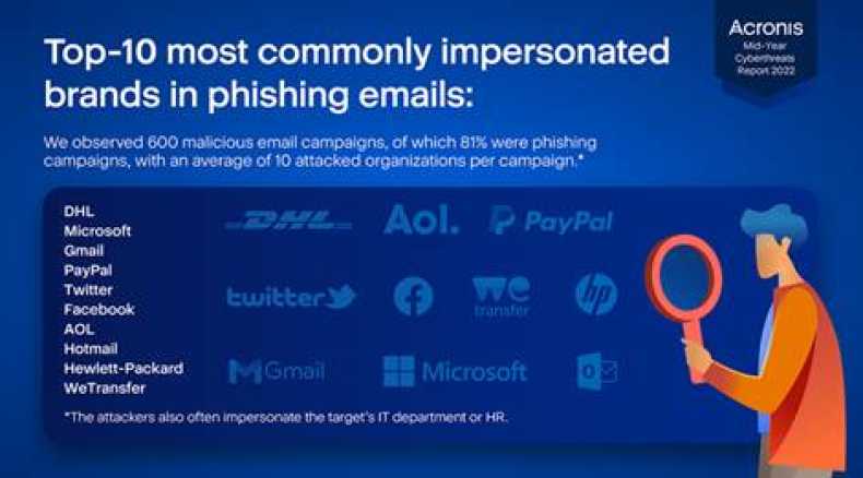 ولاستخراج بيانات الاعتماد والمعلومات الحساسة الأخرى، يستخدم مجرمو الإنترنت رسائل البريد الإلكتروني الخبيثة وعمليات الاحتيال لشن هجماتهم. حيث تحتوي قرابة 1% من جميع رسائل البريد الإلكتروني على روابط أو ملفات خبيثة، كما أن ربع رسائل البريد الإلكتروني الواردة (26.5٪) التي لم يحظرها "مايكروسوفت 365" قد تم حذفها بواسطة برمجية أمان البريد الإلكتروني من "أكرونيس".