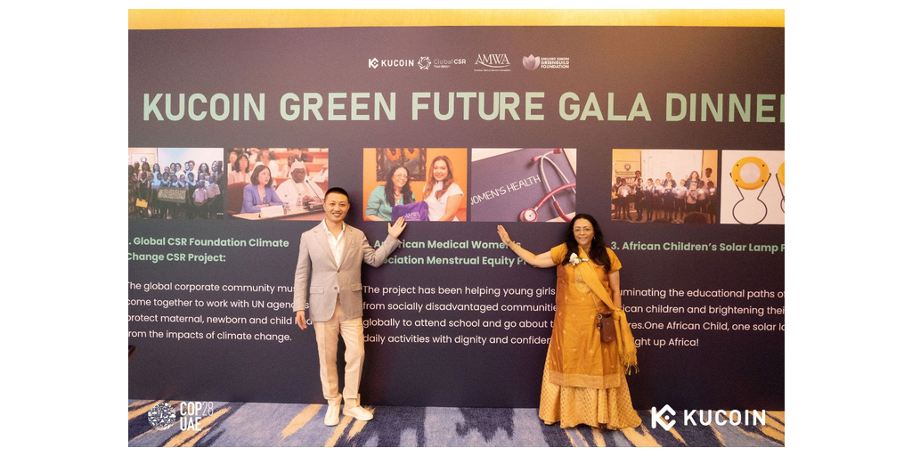 (BUSINESS WIRE)-- تفخر شركة KuCoin، بما يتماشى مع أهداف مؤتمر الأمم المتحدة للمناخ COP28، بإعلان تبرعها بمبلغ 100000 دولار أمريكي لثلاث مؤسسات، وهي Global CSR Foundation، وAmerican Medical Women's Association (AMWA) ومشروع المصباح الشمسي للأطفال الأفارقة خلال حفل عشاء "KuCoin Green Future Gala" الذي أقيم في الرابع من ديسمبر في قاعة سبابيس بولروم في منتجع أتلانتس النخلة في دبي، الإمارات العربية المتحدة. بلغ عدد الحضور 200 ضيف من مختلف البلدان استمتعوا بالمشاركة في هذا الحدث البارز.