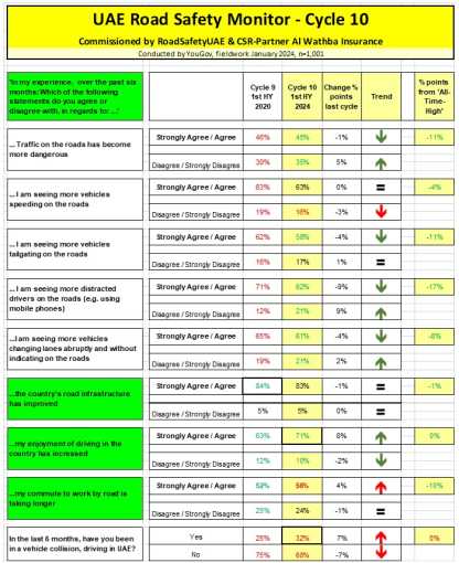 أظهرت نتائج الدورة العاشرة لدراسة "مراقبة السلامة على الطرق في دولة الإمارات العربية المتحدة" تسجيل أعلى مستوى على الإطلاق في متعة القيادة في الإمارات العربية المتحدة (71 في المائة)، واقترابها من تسجيل مستوى قياسي في تحسين السلامة العامة على الطرق (83 في المائة). كما أظهرت النتائج تسجيل تطوّر إيجابي في معظم أبعاد القيادة المتهورة، في مقابل تسجيل تطور سلبي على مستوى التعرّض لحادث (32 في المائة) ووقت التنقل اليومي (56 في المائة).