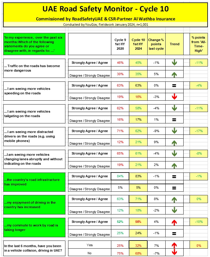 لقد أُجري هذا البحث الميداني الخاص بالدورة العاشرة لدراسة "مراقبة السلامة على الطرق في الإمارات العربية المتحدة" في يناير 2024 وصدرت نتائجه. وقد تم إجراء الدراسة بتكليف من شركة الوثبة للتأمين بالاشتراك مع منصة RoadSafetyUAE، وأعدّتها شركة YouGov (عينة من سكان دولة الإمارات العربية المتحدة عددها 1,001). تجدر الإشارة إلى أنّ هذه الدورة تُعدّ الأولى بعد انتهاء جائحة كوفيد.