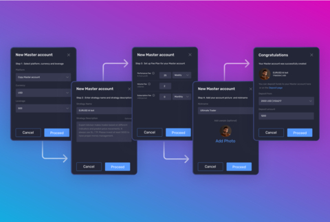 The UI has been redesigned to enhance visual appeal and user-friendliness, with complex processes now simplified through guided wizards. Form fields have been reduced from 20 to 30 to 5 clear steps with 2-3 options each. Automation of certain tasks significantly reduces the need for extra actions post creation of a master account or investor subscription. Additionally, B2Copy incorporates built-in trading bots to boost trading activity, offering users a more dynamic trading environment.
