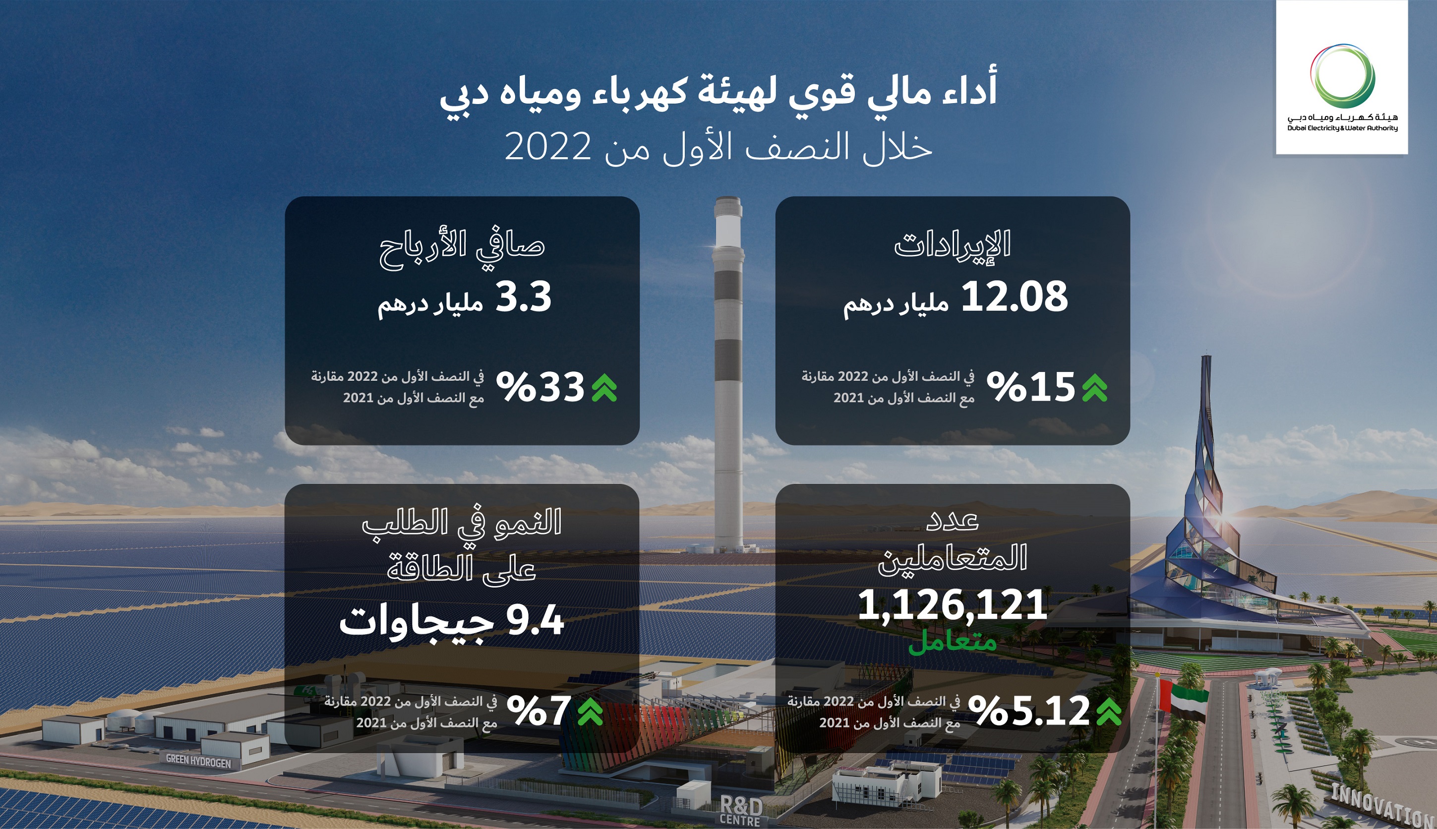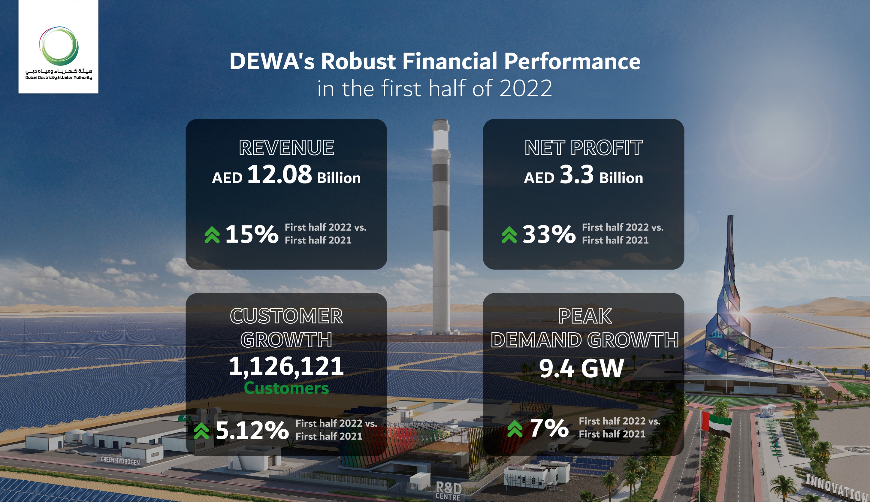 Dubai Electricity and Water Authority PJSC (ISIN: AED001801011) (Symbol: DEWA), the Emirate of Dubai’s exclusive electricity and water services provider, which is listed on the Dubai Financial Market (DFM), today reported its second quarter 2022 financial results, recording quarterly revenue of AED 7.01 bn and net profit of AED 2.61 bn. For the first half of 2022, DEWA’s revenue is AED 12.08 bn and net profit is AED 3.30 bn.