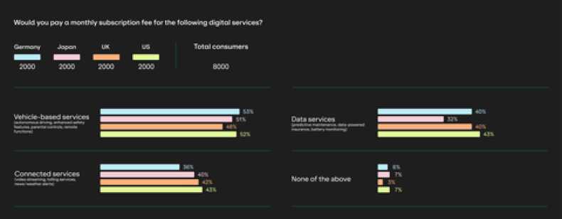 The survey grouped digital services into three categories to reveal consumer willingness to pay for each group. Nearly half (51%) of consumers are willing to pay for ‘vehicle-based services’, such as autonomous driving. Globally 40% of consumers are willing to pay for ‘connected services,’ such as video and music streaming, and 39% are willing to pay for ‘data services,’ such as predictive maintenance.