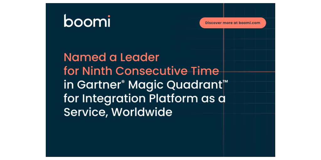 (BUSINESS WIRE)-- BoomiTM, the intelligent connectivity and automation leader, today announced that Gartner has positioned Boomi as a Leader in its Magic Quadrant for Integration Platform as a Service (iPaaS), Worldwide for the ninth consecutive time. Gartner evaluated 16 iPaaS providers on their ability to execute and completeness of vision.