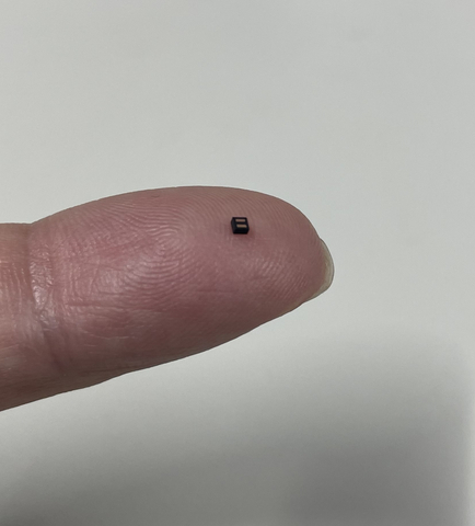 To solve this issue, Shin-Etsu Chemical has developed a high-hardness material that can be processed by dicing, and that has both necessary optical properties and a sealing capability to protect devices. Using this material, SCIVAX has successfully developed Amtelus®, the world’s smallest light source device that incorporates the functions of Platanus®. This device has achieved a significantly smaller size compared with conventional devices having a mounting area of 1 mm2 or less, 10 times smaller than conventional devices, and with half or less of the thickness.