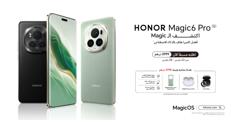 HONOR Magic6 Pro is available for pre-order Black and Epi Green for AED 3999. Upon purchase, consumers will get free gifts worth AED 2194. Consumers can get HONOR Magic6 Pro through HONOR Online Store, Hihonor, Etisalat by e&, Emax, Sharaf DG & Jumbo.