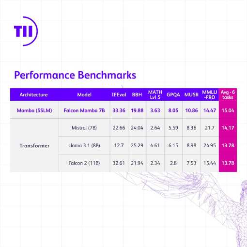 हाल ही में जारी किए गए HuggingFace बेंचमार्क के आधार पर, Falcon Mamba 7B ट्रांसफ़ॉर्मर आर्किटेक्चर मॉडल Llama 3.1 8B, Llama 3 8B और Mistral के 7B से बेहतर प्रदर्शन करता है। दूसरी ओर, Falcon Mamba 7B, पिछले बेंचमार्क में अन्य सभी ओपन सोर्स मॉडल से आगे निकल गया है और HuggingFace के नए, ज़्यादा कठिन बेंचमार्क लीडरबोर्ड पर पहला मॉडल होगा।