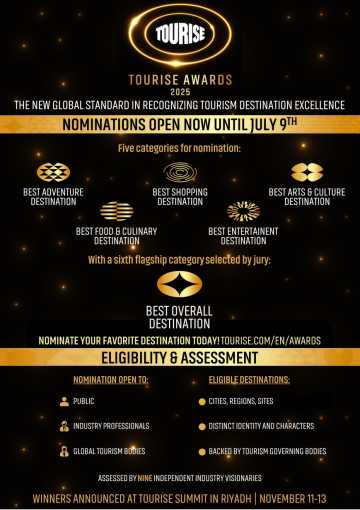 Az első TOURISE Díjak nyerteseit a 2025. november 11. és 13. között Rijádban megrendezésre kerülő TOURISE Csúcstalálkozón hirdetik ki. A csúcstalálkozó a turizmus, utazás, befektetés és innováció vezető szereplőit hozza össze — az államfőktől és a jövőbe tekintő vezérigazgatóktól kezdve a kreatív alkotókon, úttörőkön és globális befektetőkön át. Ez a rendezvény platformként szolgál majd merész ötletek kibontakoztatásához, átalakító partnerségek kiépítéséhez, és új normák alakításához az utazás jövője számára.
